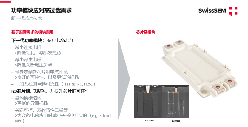 为应对高过载带来的结温升高、损耗加大等问题,功率模块需在芯片技术、封装设计和散热材料等方面实现全面升级。新一代i23芯片组采用微沟槽栅结构与软恢复二极管,有效降低导通与开关损耗;铜线绑定、DBC优化设计与直接水冷封装等技术,则显著提升模块的电流输出与散热能力。