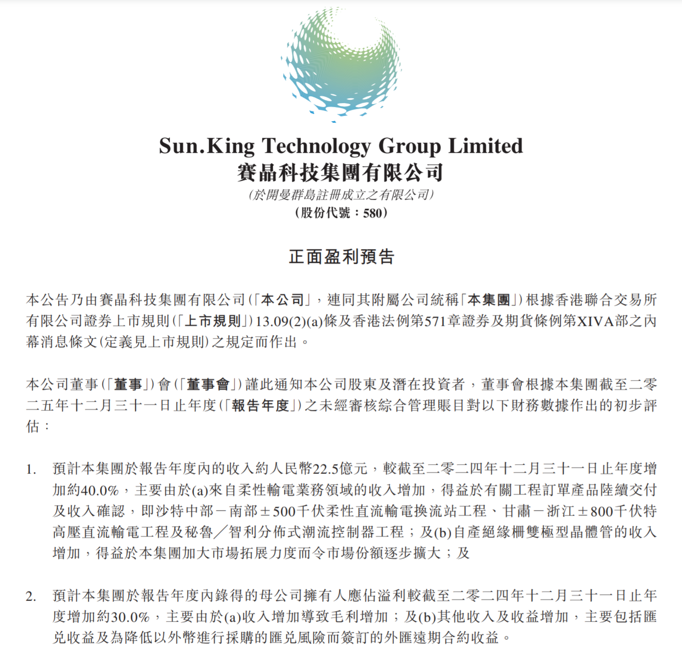 预计本集团于报告年度内的收入约人民币22.5亿元,较截至二零二四年十二月三十一日止年度增加约40.0%,主要由于(a)来自柔性输电业务领域的收入增加,得益于有关工程订单产品陆续交付及收入确认,即沙特中部-南部±500千伏柔性直流输电换流站工程、甘肃-浙江±800千伏特高压直流输电工程及秘鲁╱智利分佈式潮流控制器工程;及(b)自产绝缘栅双极型晶体管的收入增加,得益于本集团加大市场拓展力度而令市场份额逐步扩大;