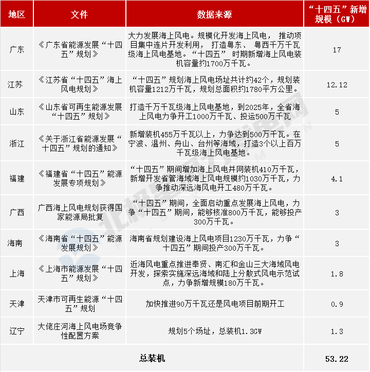 此规划一出,沿海风电开发迎来了新的市场机遇。据统计,沿海各省规划的“十四五”海上风电开发目标超过5000万千瓦,其中广东、浙江、江苏、山东省规划体量较大,分别达到17GW、5GW、12.12GW、8GW。扣除2021年新增装机的1448万千瓦,还有超过3500万千瓦新增空间。