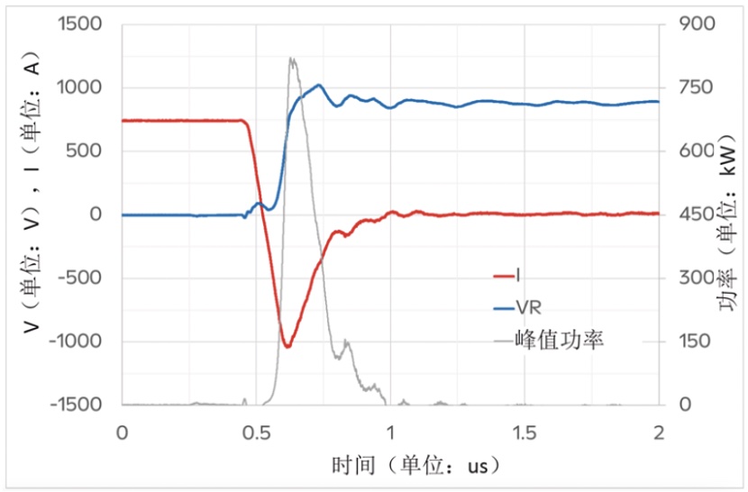 二极管的安全工作区主要取决于二极管的开关特性。为了评估二极管的稳健性,通过将外部栅极电阻Rgon减小到最小值,然后增加栅极电压Vge,从而提高二极管的换向速度。对于选定的极端情况:750A的电流和900V的反向电压,IGBT开通电压21V,进行双脉冲测试。实验发现:在175°C的外壳温度下,二级管的峰值功率超过800kW,di/dt超过10kA/us,器件依然可以稳定。选定的测试条件远远超出了任何数据表建议,进一步体现了体育滚球投注d20芯片组的高可靠性。