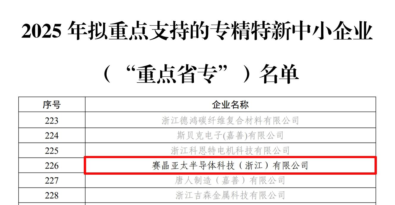 近日,浙江省经济和信息化厅公示了2025年拟重点支持的专精特新中小企业(“重点省专”)名单,赛晶亚太半导体科技(浙江)有限公司(以下简称“赛晶半导体”)凭借其在功率半导体方面的卓越表现,成功入选。这一荣誉不仅是对赛晶半导体在技术创新、产品质量及市场影响力等方面的认可,更是对公司长期以来坚持自主研发、专注核心竞争力的肯定。