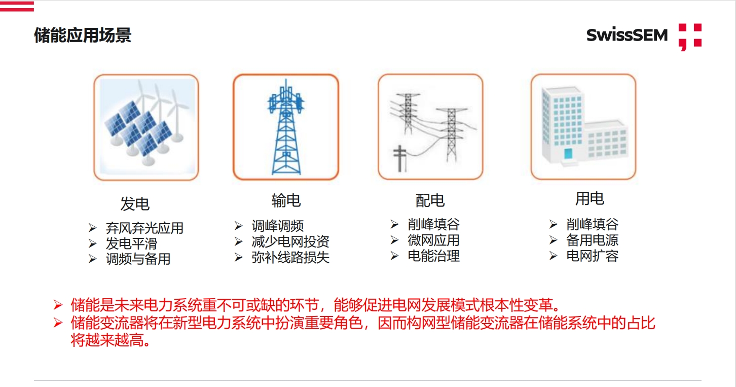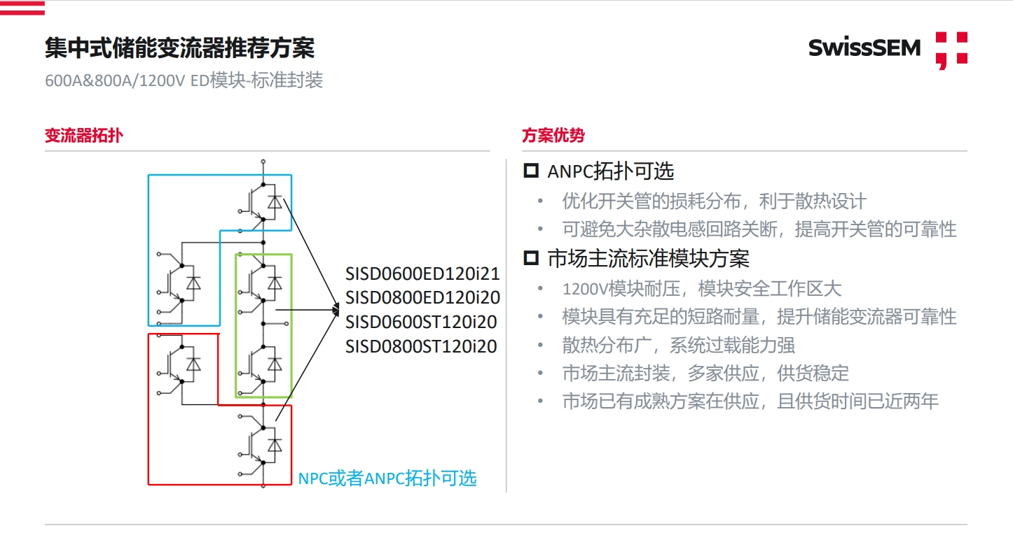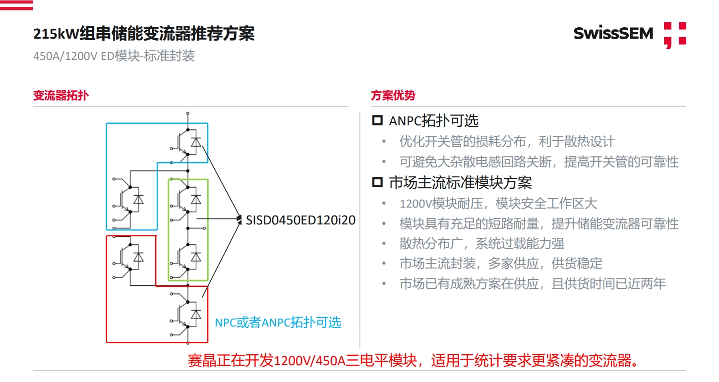 随后重点阐述了赛晶产品在储能变流器中解决方案。针对目前市场上的大功率组串变流器、集中式储能变流器和高压级联储能变流器,赛晶都有相应产品可供选用。同时,赛晶还针对市场的发展,会开发新型封装的功率模块,为客户提供更佳的选择。