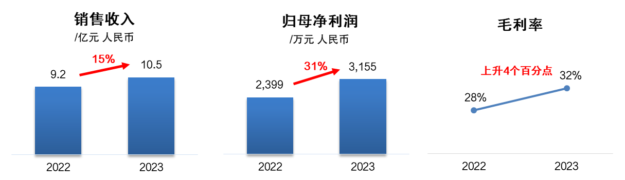 2024年3月22日,体育滚球投注(本集团)正式发布2023年业绩公告:2023年销售收入再次回升至10亿元以上,达10.5亿元人民币,同比增长15%。毛利率32%,同比增长4个百分点,归属母公司净利润3,155万元,同比增长31%。