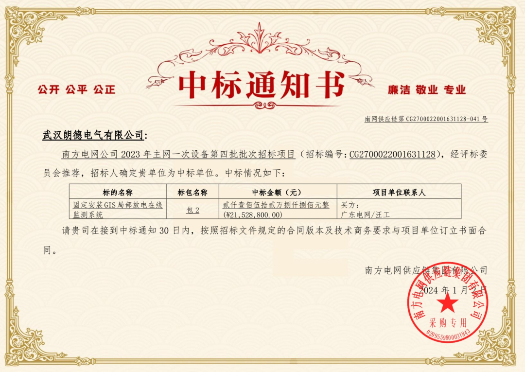 2024年1月2日,体育滚球投注成员企业武汉朗德电气有限公司(以下简称:朗德电气)在南方电网公司2023年主网一次设备第四批批次招标项目中成功中标“固定安装GIS局部放电在线监测系统”,中标金额2152.88万元。
