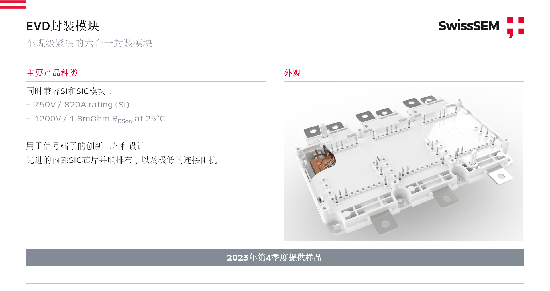 随着封装技术的发展,压注封装的HEEV模块具有低杂感、体积小等特点,能够将SiC芯片的性能得到更充分的发挥。EVD封装的产品可以让客户能够最大可能的借鉴既有Si产品的系统设计,同时可以有灵活的商务供应。