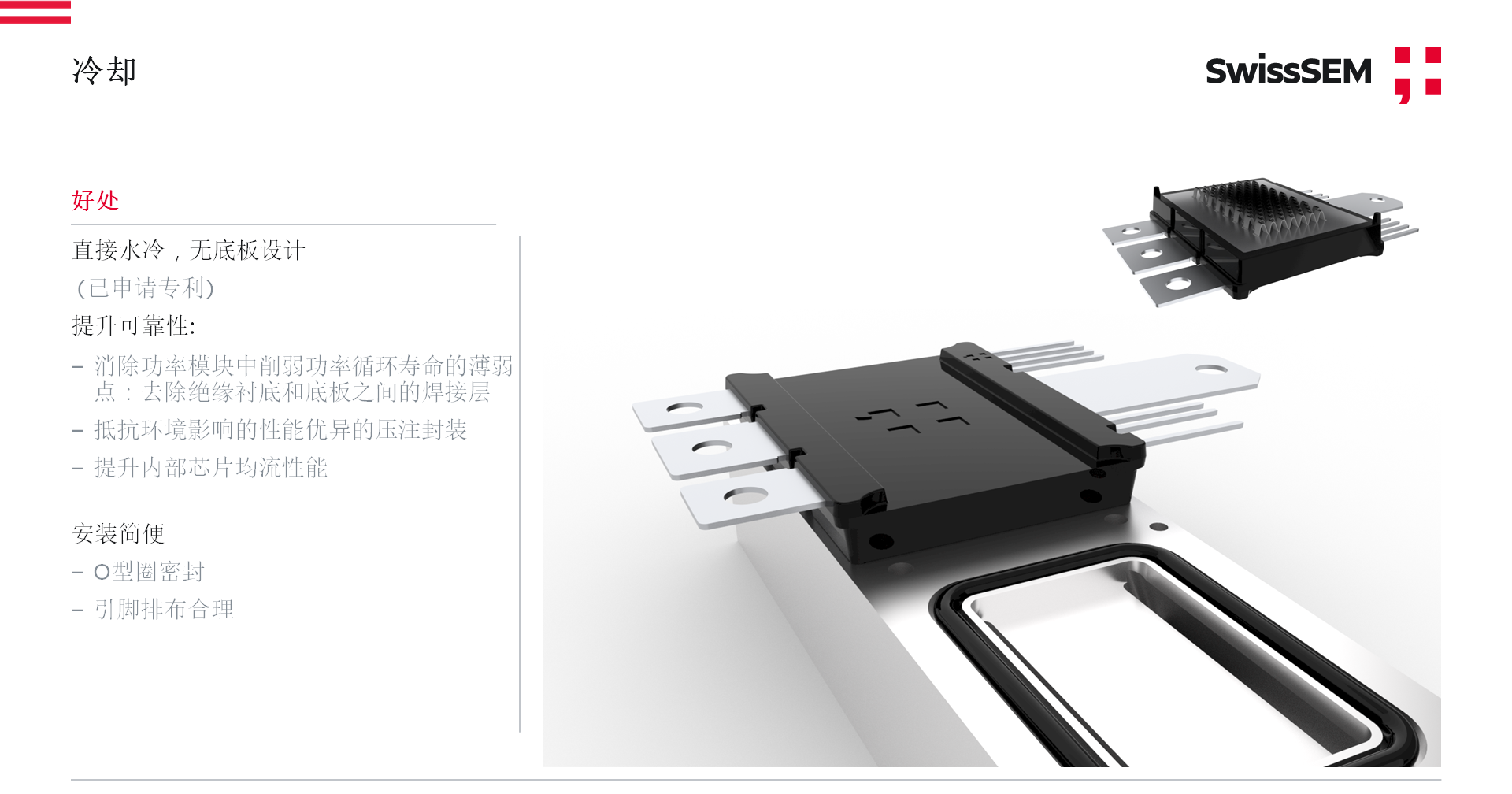 不仅如此,该模块设计体积非常紧凑,有助于实现电驱的轻量化,在冷却方面采用直接水冷,以及先进陶瓷材料降低热阻和O型圈密封设计;在可靠性方面采用压注模封装,提高对环境友好性,并保证更好的功率循环寿命。此外,该模块还采用了无铜底板技术,避免了铜底板和AMB(绝缘基片)之间大面积焊接层,以实现更高的功率循环寿命和更低的热阻。同时,还具有杂散电感非常小,适合SiC高速开关等特点。
