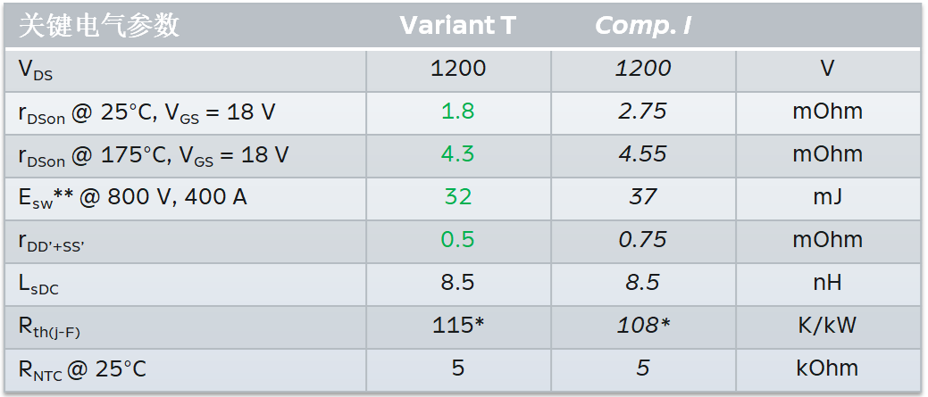 EVD封装SiC模块(1200 V)与业界头部企业相同规格封装模块对比主要参数