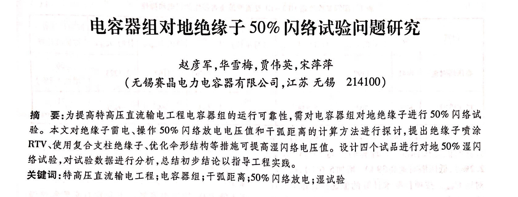 《电容器组对地绝缘子50%闪络试验问题研究》由无锡赛晶赵彦军,华雪梅,贾伟英,宋萍萍撰写,主要论述了结合工程项目的实际应用,有针对性的进行绝缘子U50试验验证及相关研究,为直流输电电容器组的安全运行奠定扎实基础。