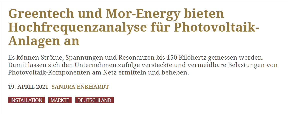 该篇报道主要介绍了,MorEnergy公司近期正在与德国Greentech公司,在光伏系统的高频分析开展合作。