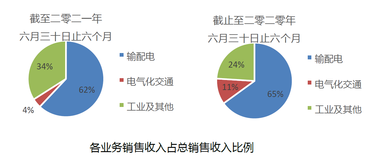输配电领域,本集团于回顾期内实现销售收入人民币3.03亿元,占期内总销售收入约62%,毛利率为27.7%。根据「十四五」规划及国家电网公司发布的「碳达峰、碳中和」行动方案,高压直流输电领域投资和建设规模将保持较高水平,「十四五」期间将建成七个国内特高压直流输电工程,新增输送容量5600万千瓦。2021年上半年,集团主要交付「陕北-武汉」工程、「白鹤滩-江苏」项目、±800kV复龙换流站项目订单,及大湾区南粤直流背靠背工程订单。