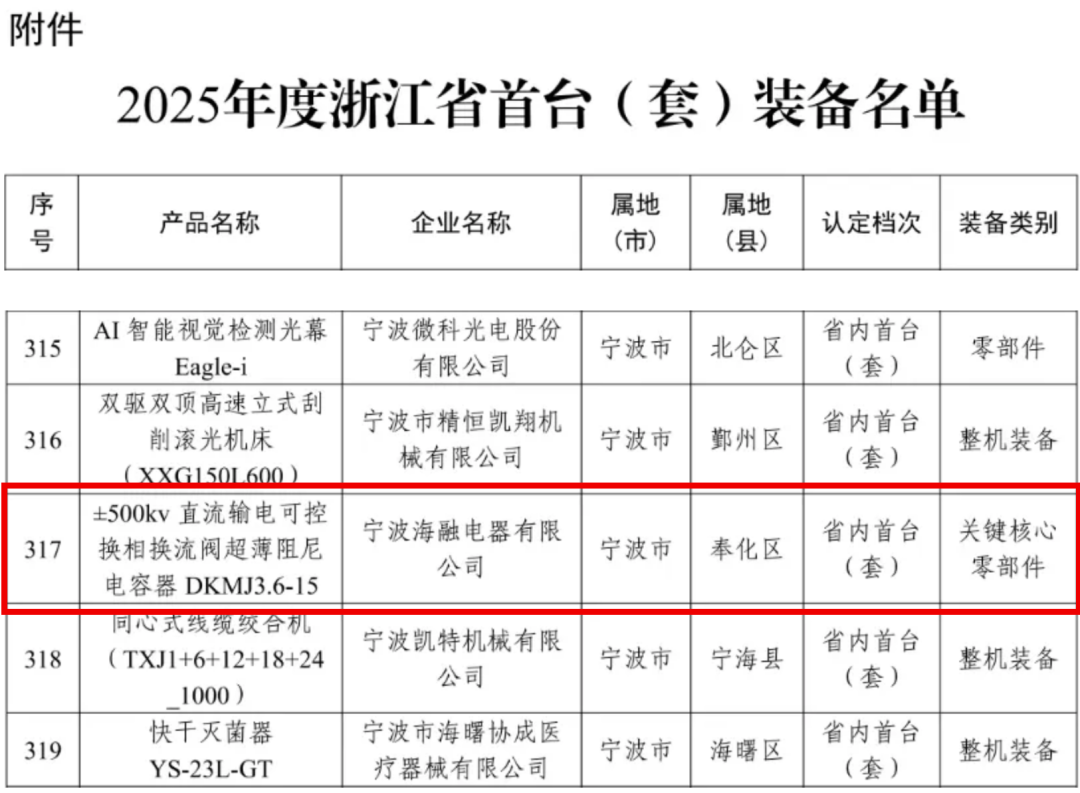 1月21日,浙江省经济和信息化厅公布了2025年浙江省首台(套)装备名单,其中体育滚球投注子公司-宁波海融电器有限公司参与的“±500kv 直流输电可控换相换流阀超薄阻尼电容器 DKMJ3.6-15”成功入选,标志着该产品在实现重大技术突破、拥有自主知识产权方面获得省级权威认可,为我国直流输电核心装备国产化进程注入新动力。