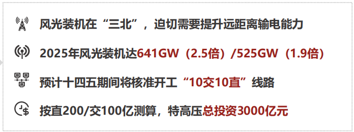 随着新能源装机规模迅速扩张,未来逐步替代部分退役火电机组。“特别是在风光装机规模庞大的‘三北’地区,迫切需要提升远距离输电能力,此外,‘十四五’期间,将核准开工的‘10交10直’特高压线路,对于在线监测、智能感知、数字化技术等装备也将释放出积极信号。”陈勇表示。
