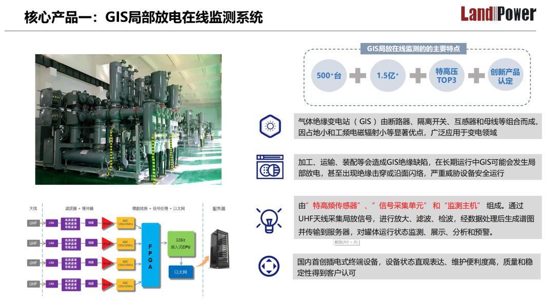 朗德电气研发的GIS局部放电在线监测系统,由“特高频传感器”“信号采集单元”和“监测主机”组成。通过UHF天线采集局放信号,进行放大、滤波、检波,经数据处理后生成谱图并传输到服务器,对罐体运行状态监测、展示、分析和预警,具有灵敏度更高、零部件全面国产化、监测范围广、准确性高,产品适应性强等特点。