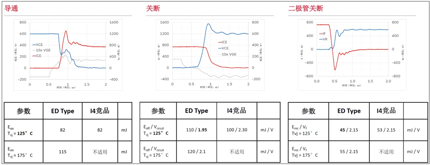 为了验证i20和d20芯片组开关特性优越性,体育滚球投注在已经量产的1200V 750A ED系列模块SISD0750ED120i20上与行业国际领军企业同款IGBT4的同平台模块进行了对比测试,需要说明的是IGBT4模块目前最高结温只有150℃。通过对比发现两个模块开通损耗基本相当,关断损耗采用i20芯片组的ED模块略高,但饱和导通压降的ED模块更低。基于d20芯片组ED模块二极管与IGBT4具有相同的正向压降,且能够保持更低的反向恢复损耗,从测试来看采用i20和d20芯片组模块要优于国际领军企业的同类第4代IGBT模块。